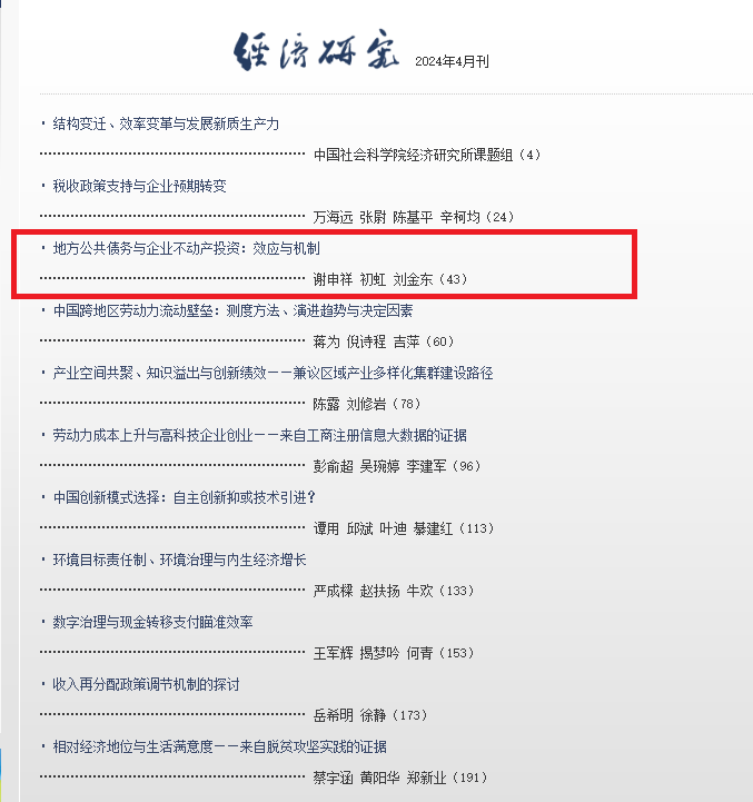 近日,经济学院谢申祥教授(第一作者)的合作论文:《地方公共债务与企业不动产投资:效应与机制》在国内经济学顶级期刊《经济研究》2024年第4期发表,该刊系我校特类期刊。