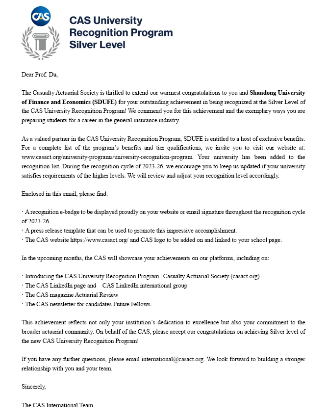 3月14日,北美产险精算师协会(Casualty Actuarial Society,CAS)致函我校,确认山东财经大学精算项目已通过其高校认证项目(University Recognition Program)的严格审核并荣获“Silver Partner”认证。这标志着我校成为中国大陆首批获此殊荣的三所高校之一,彰显了我校在精算教育领域的卓越实力。截至目前,全球共有47所高校通过CAS的高校认证项目,中国大陆仅三所高校,分别为山东财经大学、湖南大学和中央财经大学,获得认证的高校将在精算教育和研究方面得到CAS提供的特别资助。